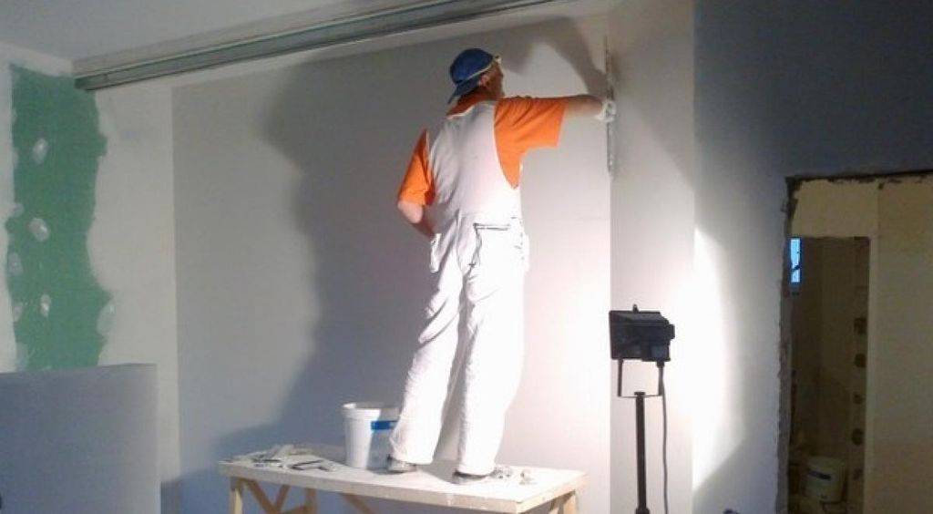 Перед нанесением шпаклевки поверхность желательно прогрунтовать. На такие стены шпаклевка ложится более тонким слоем и быстрее высыхает, не впитывая влагу из поверхности стен и потолков.