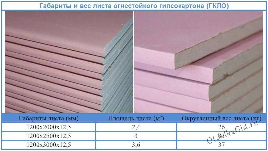 Присутствие добавок влияет на массу плиты, вследствие чего создаваемая нагрузка отличается от параметров обычного ГКЛ, поэтому подшивка может потребовать усиления некоторых участков. Чаще всего встречаются огнестойкие листы шириной 120 см, длиной 250 см и толщиной 12,5 мм. Вес такого изделия составит 30,5 кг, а одного квадратного метра – 10 кг. Разница со стандартной плитой обычно варьируется в пределах 3–4 кг.