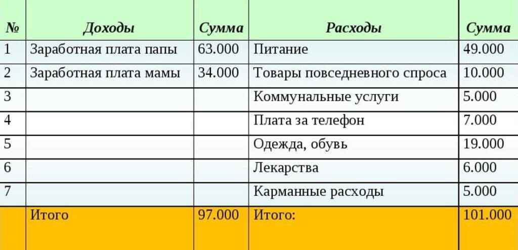 Важно группировать расходы, чтобы оценивать их долю в семейном бюджете. Например: еда, ЖКХ, траты на детей (школа, кружки, дополнительные занятия), расходы на автомобиль, интернет и подписки и т.д