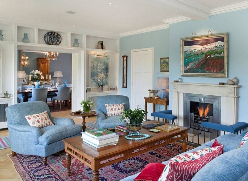 Красный с небольшим количеством золота добавит ощущения торжества и праздника. Оливковый тяготеет к интеллектуальным играм и чтению, интересным разговорам и глубоким высказываниям. Сочетание фиолетового и серого оживит любую дружескую беседу и настроит всех для приятного времяпрепровождения. Синий — олицетворение спокойствия и умиротворения. Но используется аккуратно, чтобы не сделать интерьер мрачным и темным.
