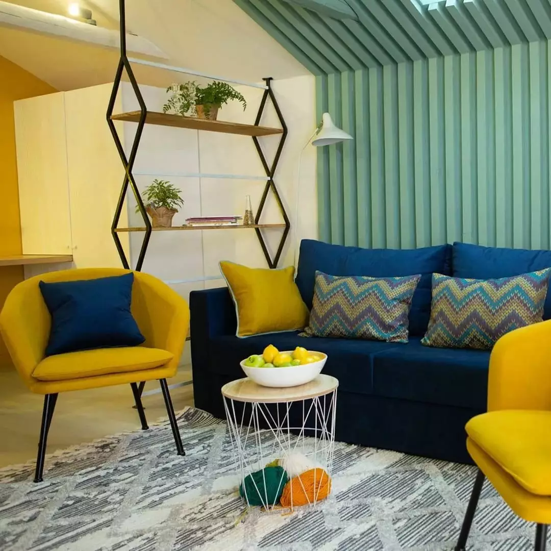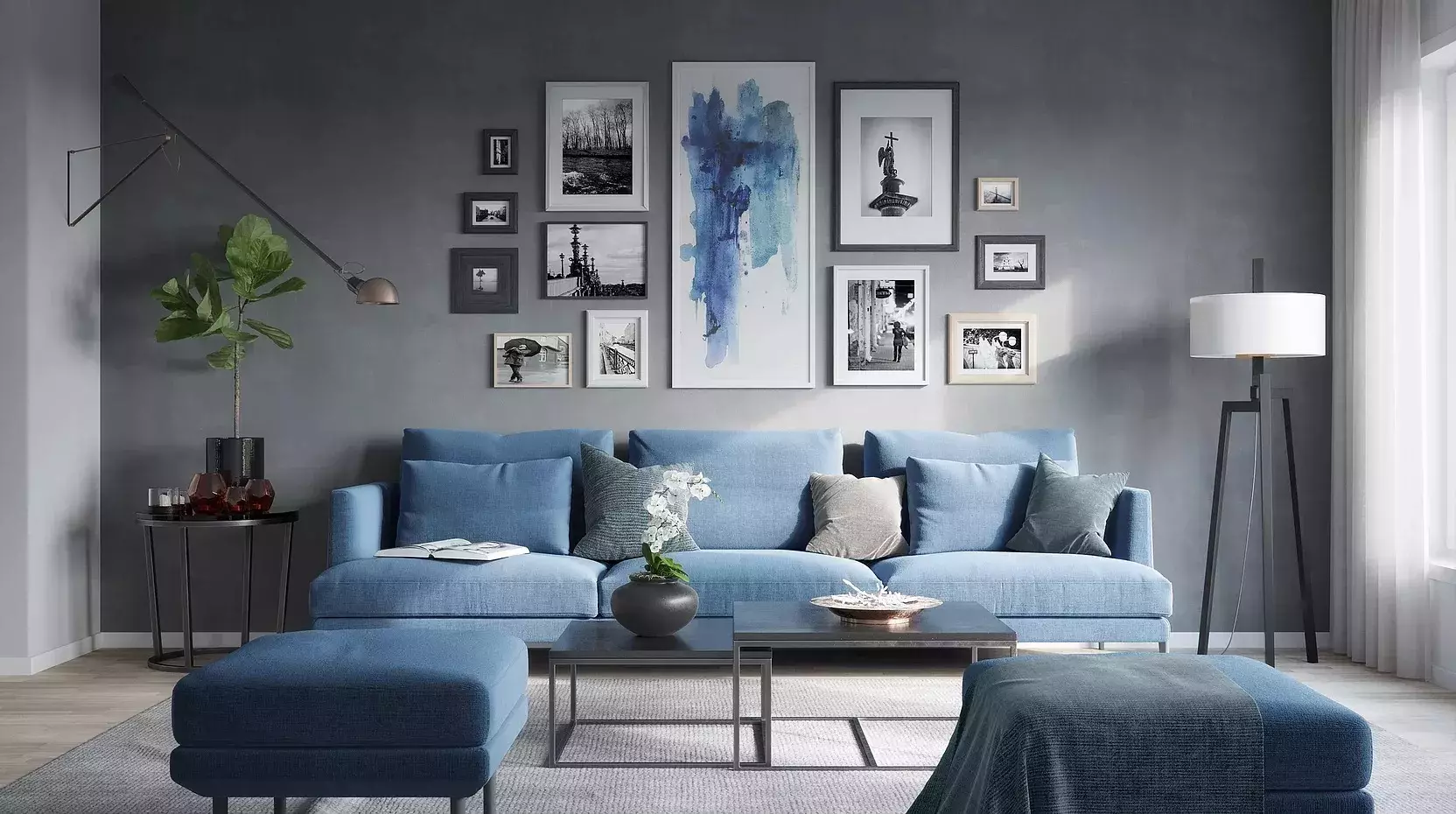 Узнаем, насколько такая комбинация соответствует теории. Интерьер следует разложить на цветовую схему. Напарников синему можно подобрать разными способами.