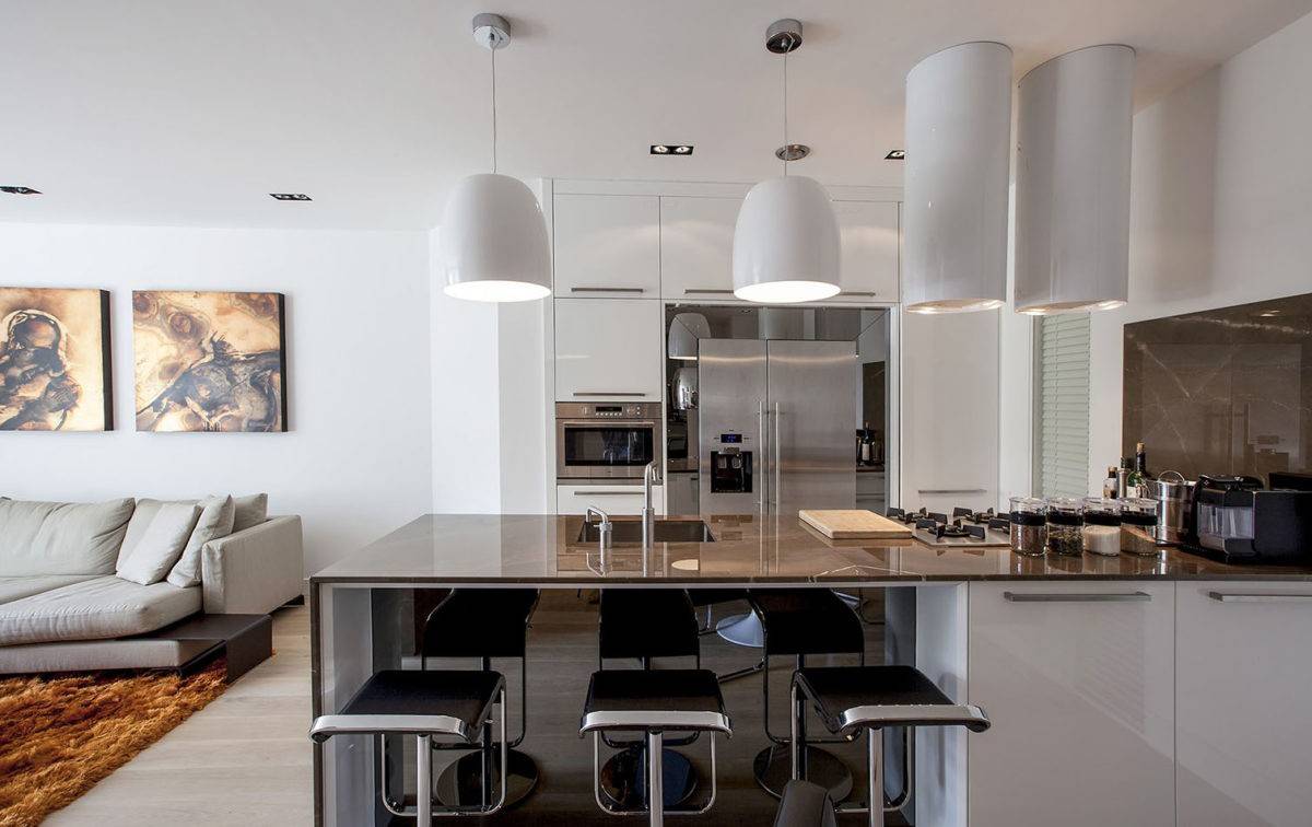 - В зону отдыха будут проникать запахи и звуки рабочего кухонного процесса. Для частичного решения проблемы потребуется установить мощную вытяжку и приобрести бесшумные бытовые приборы.