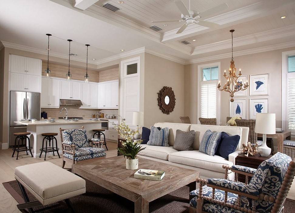 Продумывая дизайн гостиной, совмещенной с кухней, нужно отказаться от полного сочетания стилей или фактур, напротив, приветствуется плавный переход одного интерьера в другой. Граница, которая отделяет кухонную зону, должна быть четко обозначена.