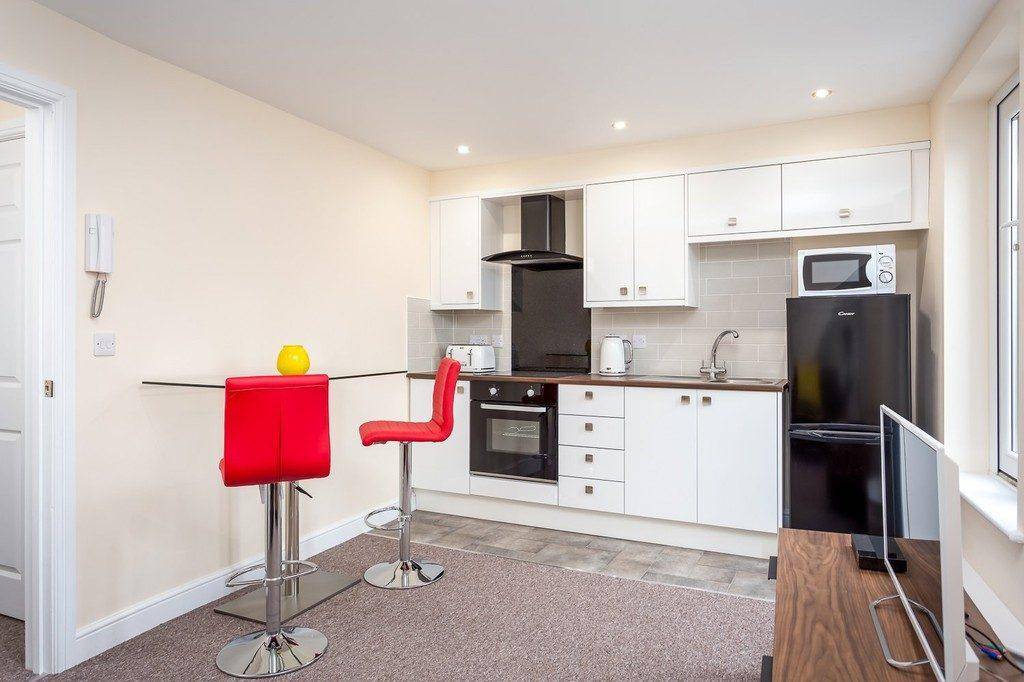 Стационарные стойки для маленьких помещений являются частью кухонного гарнитура. Конструктивно стандартная деталь интерьера представляет собой продленный фрагмент столешницы, один край которого зафиксирован на несущей трубе-опоре. Столешница-придаток может располагаться перпендикулярно относительно поверхности кухонного гарнитура либо являться прямым ее продолжением.