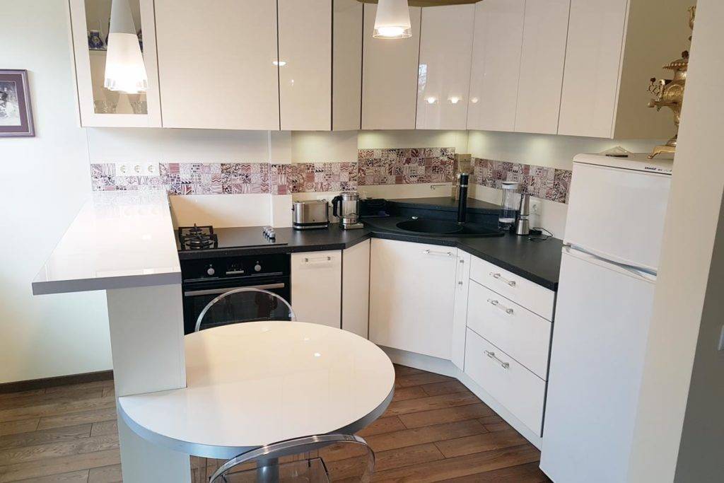 Зачастую такое сочетание используют в угловых кухнях модерн с барной стойкой. В этом случае – откажитесь от обеденного стола, он только займет лишнее место.