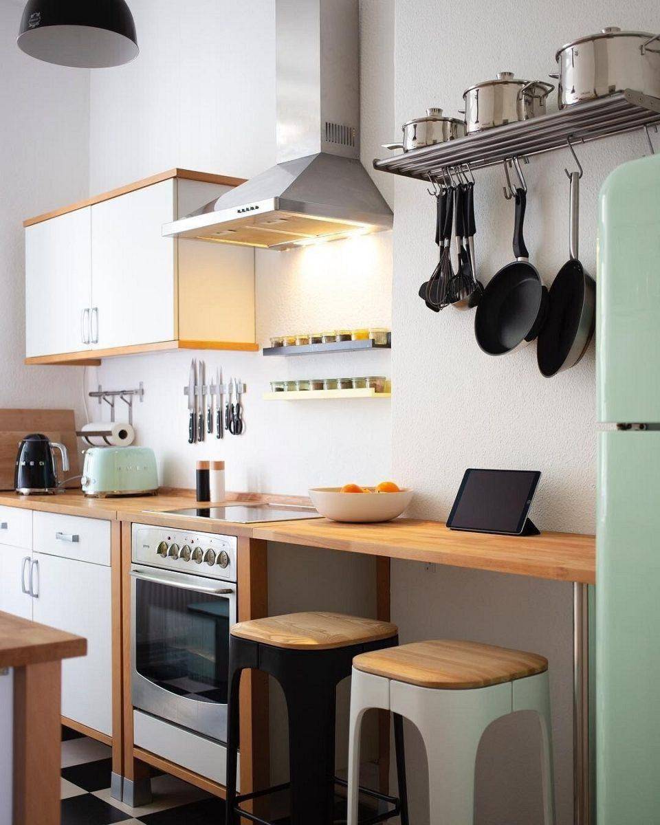Натуральные деревянные поверхности не дадут кухне стать слишком холодно-минималистичной. Это могут быть стол, столешница, напольное покрытие или даже отделка фрагмента стены. Уместным будет повесить деревянную утварь на стены на крючках.