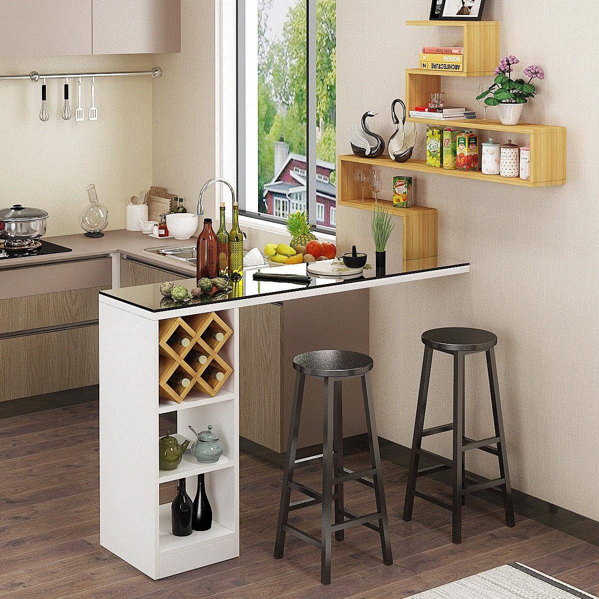 Классическая барная стойка представляет собой столешницу, расположенную на уровне 110-115 мм от пола и зафиксированную на консолях. Дополнительным элементом мини бара выступают высокие табуреты либо стулья. Однако классическую конструкцию не всегда можно вписать в интерьер маленькой кухни с барной стойкой, поэтому современные дизайнеры предлагают несколько вариаций мини-баров с более оптимизированными размерами.