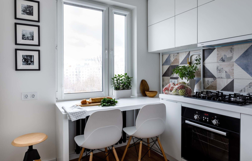 Маленькая кухня со стойкой у окна – всегда хорошо. Во-первых, такие бары сохраняют свою высоту. Во-вторых, много места не занимается.