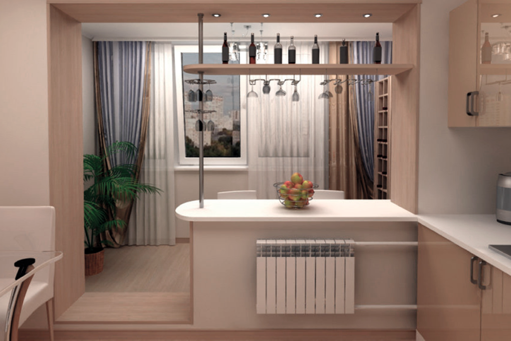 Интересным дизайнерским решением для маленьких кухонь с прилегающим балконом является обустройство встроенной барной стойки в области расположения балконного блока. Но для внедрения проекта в жизнь потребуется перепланировка помещения. Балконные двери и окно демонтируют, оставшийся участок стены и подоконник переоборудуют в барную стойку. Такой прием позволяет увеличить пространство кухни за счет присоединения дополнительной площади. Барная конструкция выступает связующим звеном между кухней и балконом.