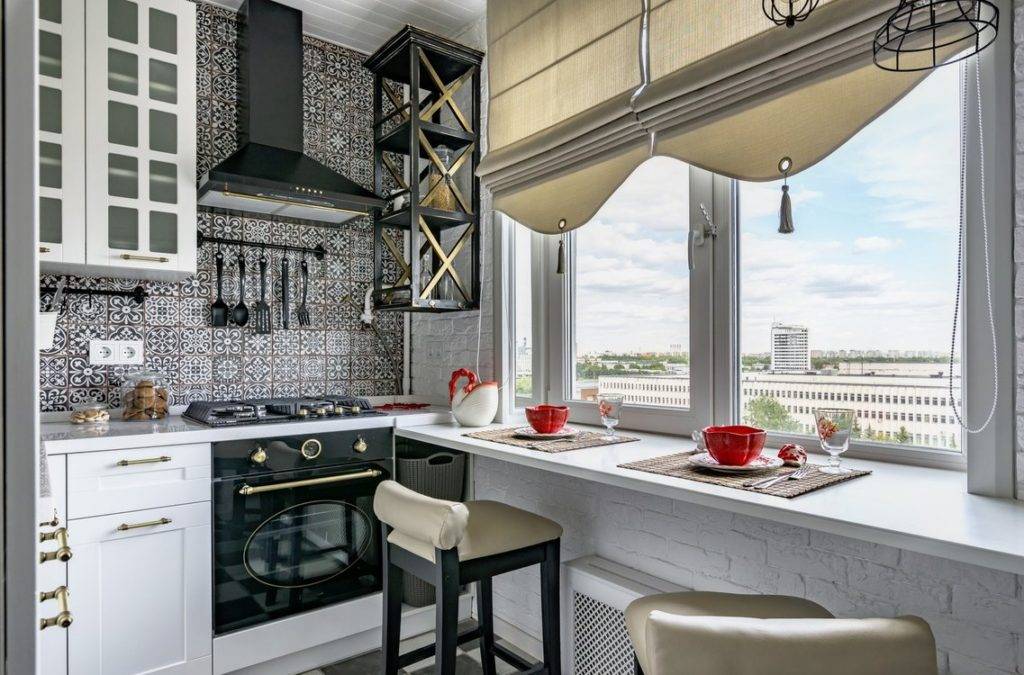 Барную стойку для кухни в хрущёвке часто располагают у окна, объединяя с подоконником. В результате получается просторная столешница, которая вполне позволит разместить трёх человек. Её ширина должна быть такой, чтобы можно было свободно сидеть и не упираться коленями в стену или радиатор. Однако подобное расположение требует выполнения следующих условий: