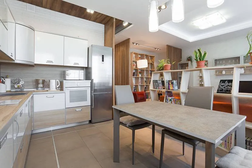 - Один из минусов объединённого пространства – шум работающей бытовой техники. Возможно, некоторые агрегаты придётся заменить на более тихие. Если вас раздражает звук льющейся воды, подумайте о качественной сантехнике.