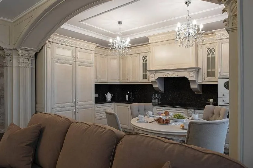 Модерн. Стиль для тех, кому нравятся роскошные интерьеры экстра-класса. Для создания в кухне-столовой нужной обстановки понадобится изысканная мебель и дорогие отделочные материалы.