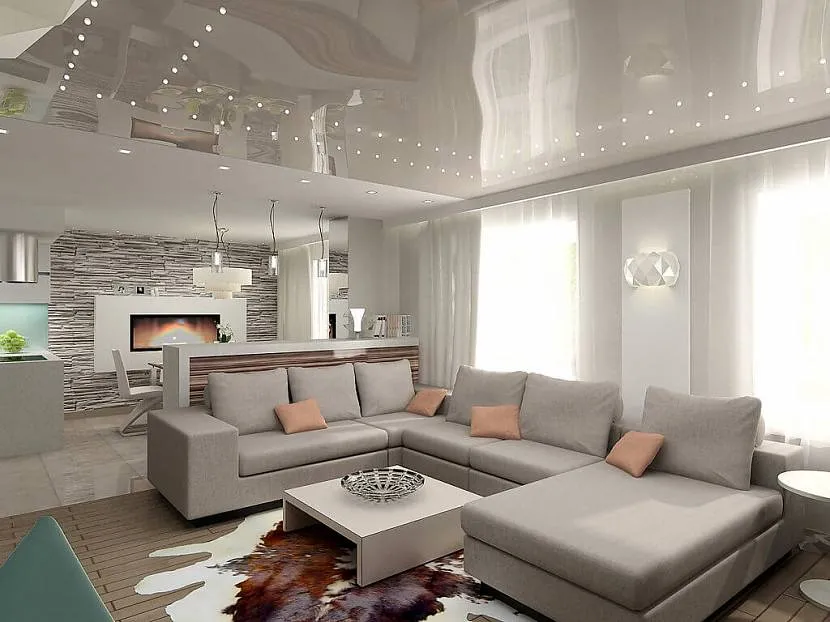 Глянцевые поверхности нравятся далеко не всем, но они отражают свет, добавляют объем, и потому выгодны в небольшой гостиной-столовой. Если вы против глянцевых фасадов, подумайте о глянцевом натяжном потолке. С этой же целью рекомендуется в качестве декора использовать зеркала.