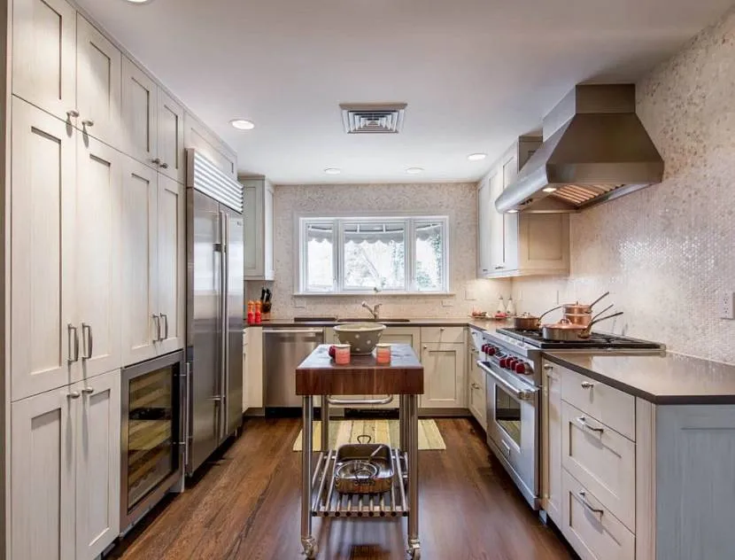 Параллельная планировка будет уместна в том случае, если помещение имеет вытянутую форму. Задействовав обе стены, получится удобно разместить плиту, столешницу и мойку по одну сторону и холодильник, буфет и т. д. – с другой.