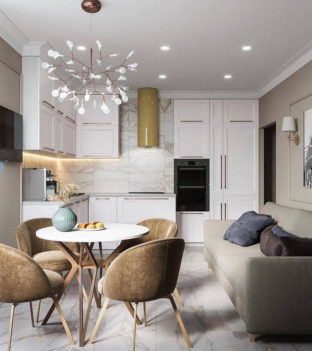 Универсальным считается угловой тип — он экономит пространство. Подойдут П-образные, линейные типы кухонь. Полуостровной тип хорошо справляется с зонированием пространства. На такой кухне много рабочих поверхностей. Этот вариант позволяет разместить много бытовой техники. Такой тип сам по себе зонирует пространство.
