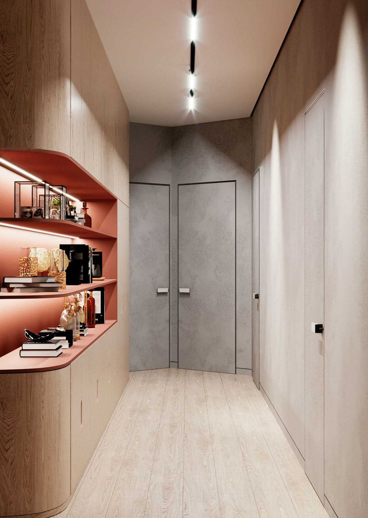 3. Тёмные тона зрительно уменьшают помещение. Осветлите стены, а в шкафы и полочки добавьте освещение.