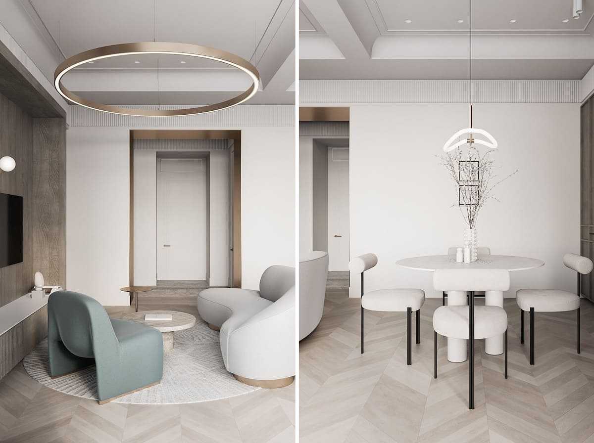 Латунь в оформлении стульев и светильников прекрасно сочетается с хромированной техникой