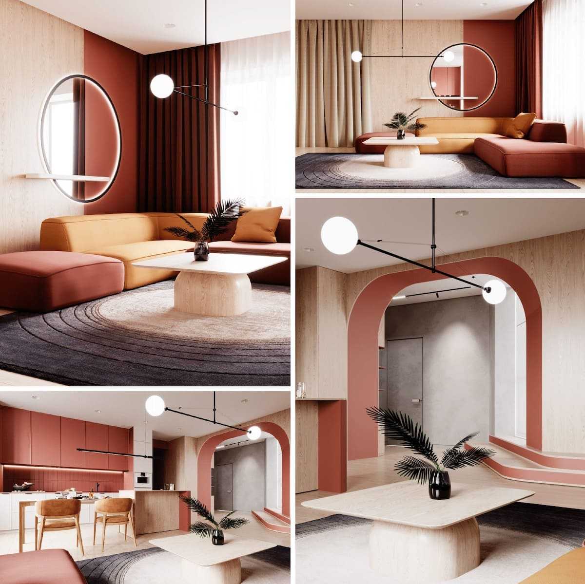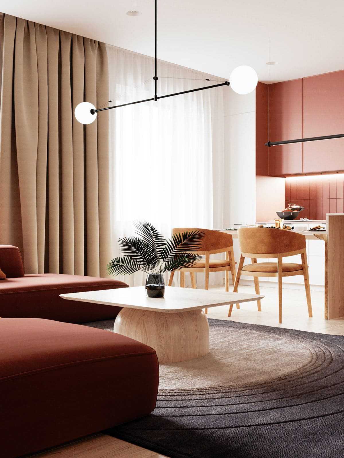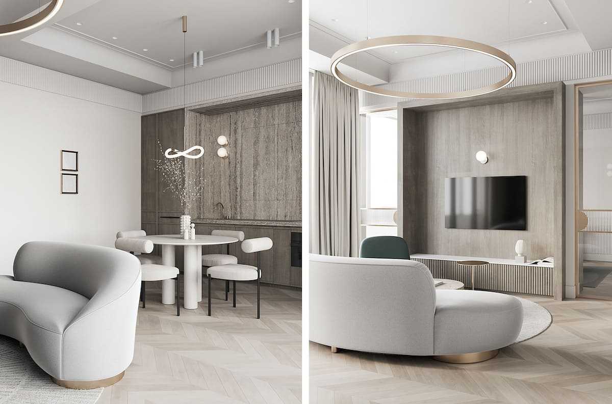 Поскольку тенденции в дизайне, в всеобщем плане, одинаковы для всех жилых помещений, вы смело можете выполнить кухонную пояс и гостиную в едином стиле. Или зонировать их при помощи разных дизайнов. Основное – всё же выбрать единое стилевое решение, но отразить его несколько разными методами.
