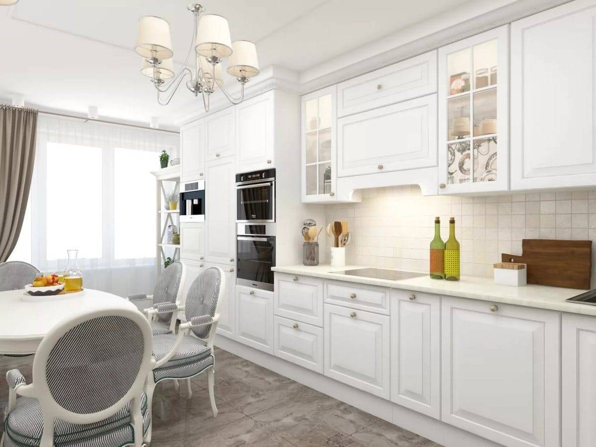 Такую кухню получится выполнить в любом стиле, помехой не станет размер или другие особенности помещения. Не обязательно использовать исключительно белый цвет. Допустимы разные краски.