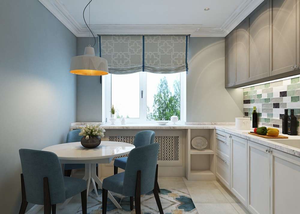Идеальный вариант для тех, кто ценит простоту, функциональность и элегантность. Обустроить такое помещение довольно просто, для отделки стен можно использовать любые материалы: штукатурку, моющиеся обои, гипсовые панели, керамическую плитку. Светлые тона наполнят кухню легкостью, сделают ее более просторной.