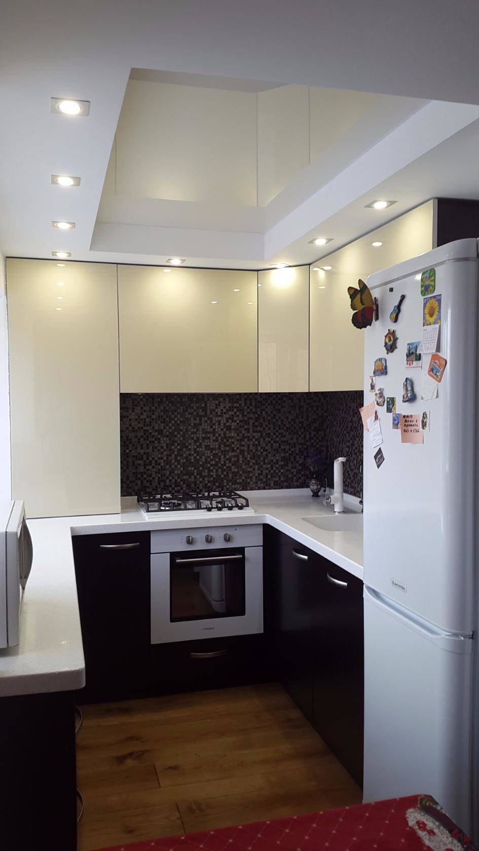 Оптимальный вариант оформления потолка в маленькой кухне — светлая натяжная пленка или же простое окрашивание. Выровнять поверхность, а также избежать микротрещин на штукатурке поможет стекловолокно.
