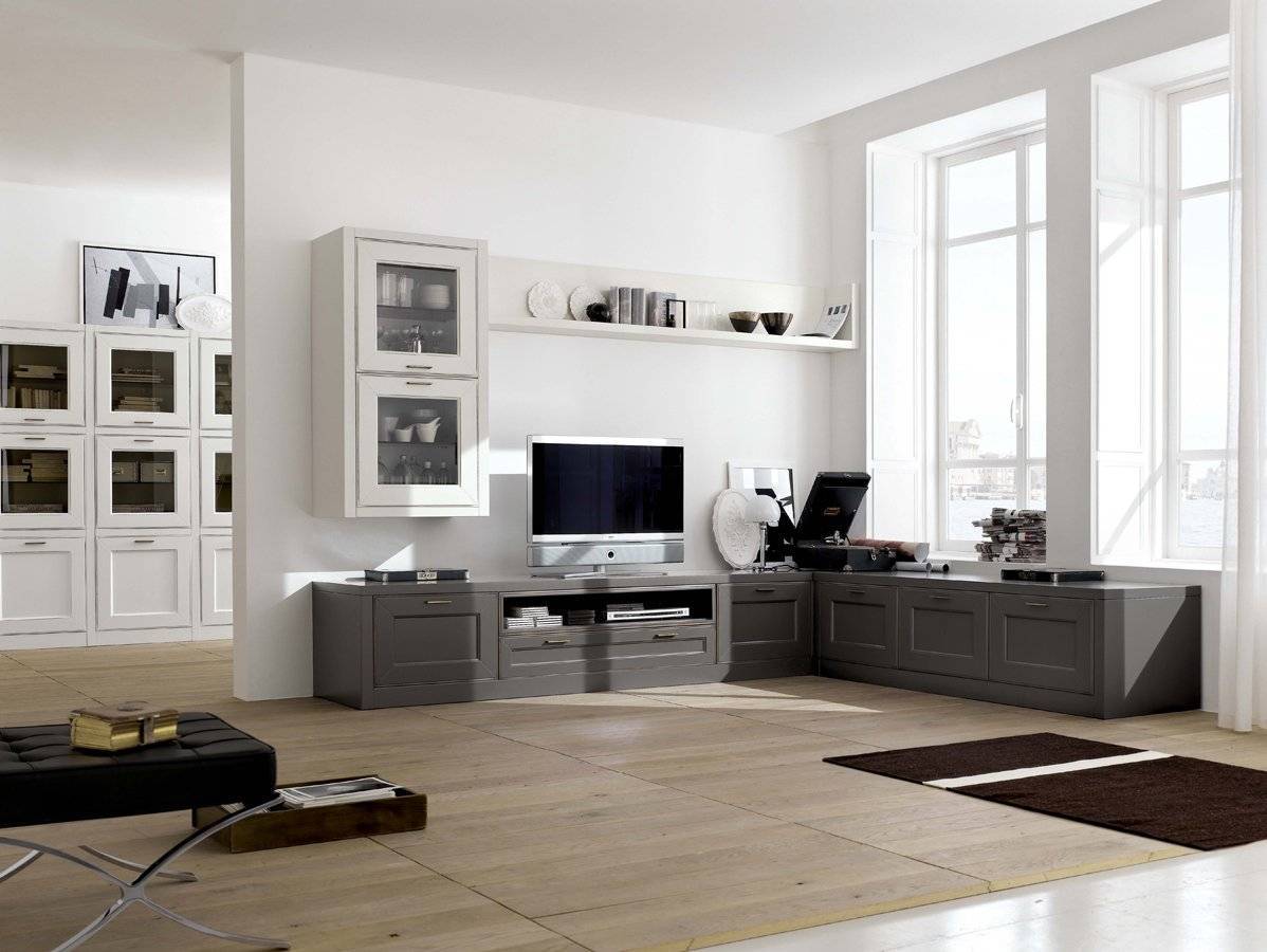 Встраиваемая угловая стенка в интерьере гостиной
