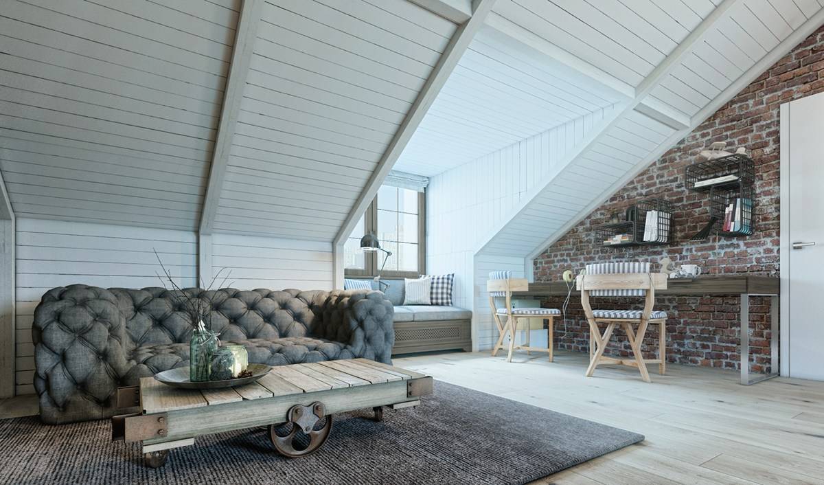 Стиль часто применяют в чердачных помещениях с нестандартным пространством