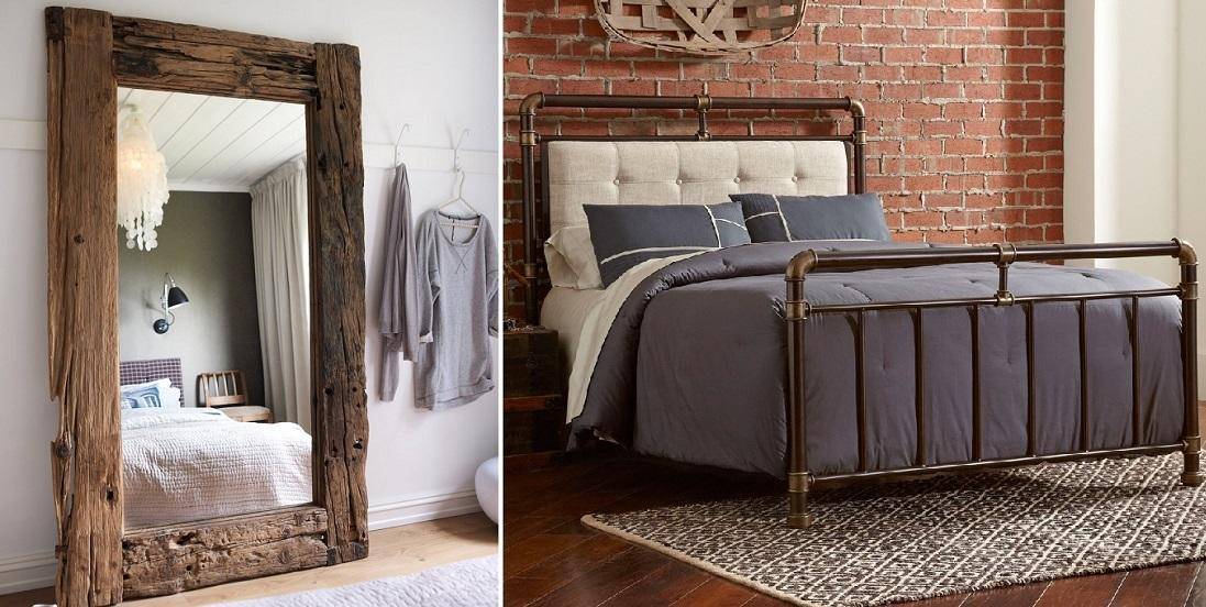 Зеркало в раме из натурального дерева или высокая металлическая кровать – великолепное завершение образа спального помещения в стиле лофт