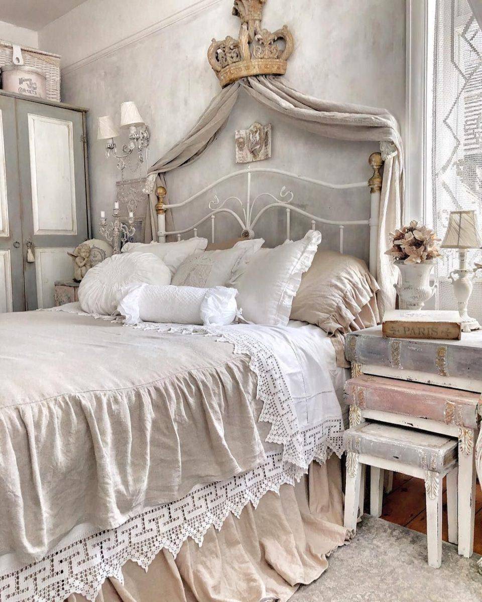 Главная составляющая спальни – это кровать, она может как и приковывать к себе все основное внимание, так и оттенять обстановку в комнате. Кровать в стиле шебби шик может быть практически из любого материала – дерево, ДСП, МДФ, металл