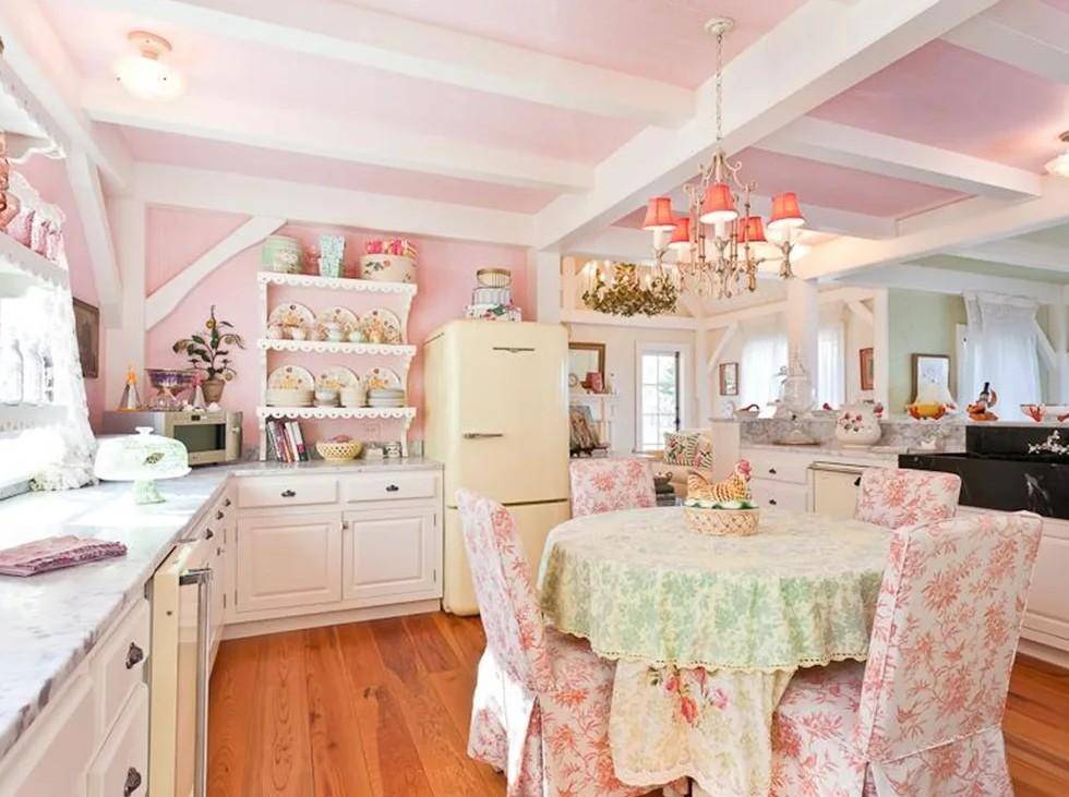В интерьере присутствует много милых мелочей, аксессуаров, винтажных предметов, декора. За прообраз берётся уютный бабушкин дом с мягким диваном и креслами, просторным столом для чаепития с пирожками, подушками и кружевными салфетками.