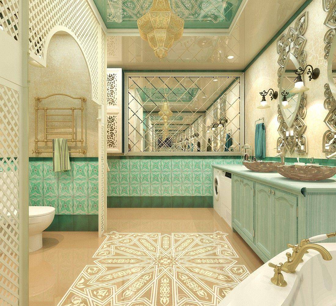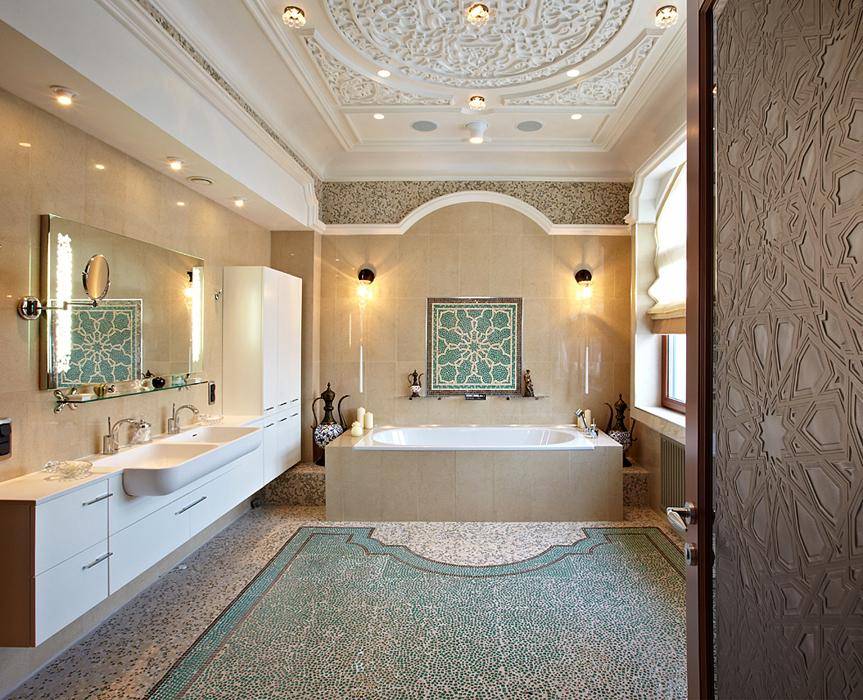 В просторных помещениях можно использовать больше мебели и декора, характерного для восточного стилистического направления. Для дизайна интерьера такой ванной подойдут более яркие и насыщенные оттенки. Выделить необходимую зону можно светом и оригинальной отделкой стен.