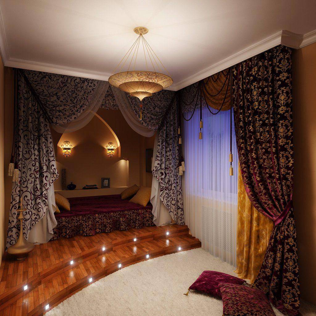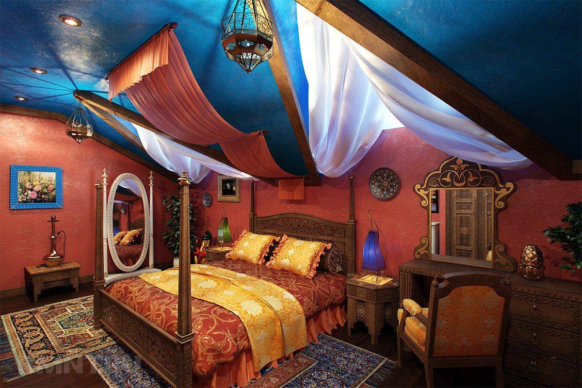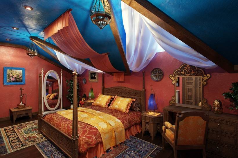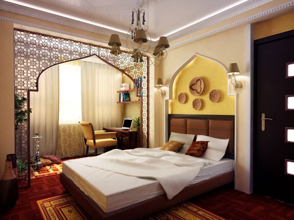 Арабский колорит хорошо подходит для оформления спальни, чтобы почувствовать себя султаном или восточной царицей. Такой стиль помимо уюта и тепла добавит комнате нотки загадочности и сказочности