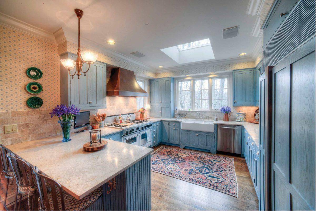 Деревянный кухонный гарнитур будет хорошо смотреться на фоне ярких стен. Мебель украшают стеклянными вставками, резьбой и дорогой фурнитурой.