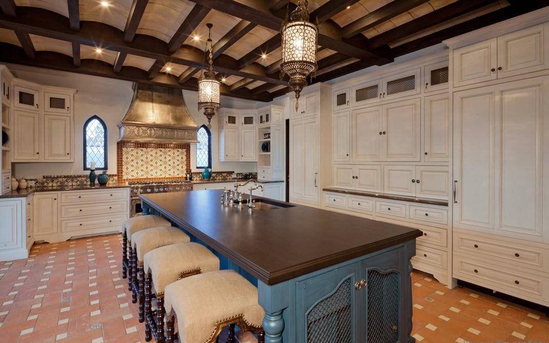 На первом месте в интерьере кухни в восточном стиле находится функциональность. Для того чтобы частично наполнить интерьер восточными нотками входную дверь можно украсить аркой, а для отделки кухонного фартука использовать мозаику. Необычные аксессуары, посуда, кухонные принадлежности помогут подчеркнуть изысканность и утонченность стиля.