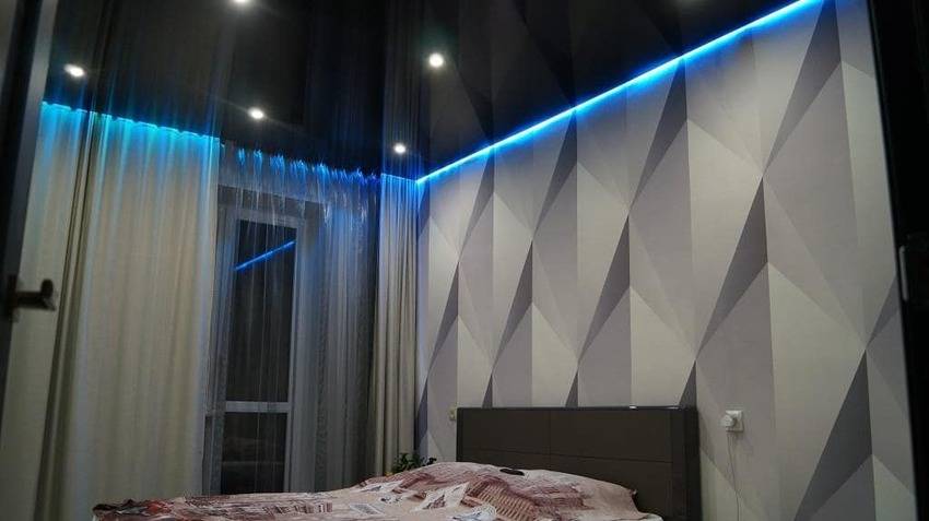 Для комнаты с темной отделкой подойдет периметральное освещение. Светильники устанавливают в центральной зоне помещения и возле спального места. Иногда с помощью подсветки декорируют предметы мебели, карнизы, полки или шкафы.