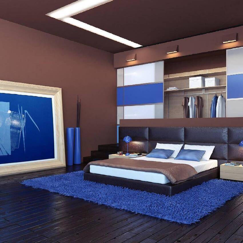 Синий. Сине-черный, лазурный, сапфировый, ультрамариновый — цвета моря или ночного неба. В сочетании с белым создают эффектный контрастный тандем, со светло-синим — природный, успокаивающий дизайн спальни в темных тонах.