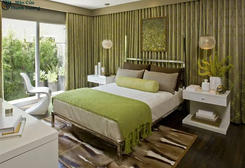 Сочные зеленые цвета для обустройства спальни подбирают в темном градиенте. Есть решения, когда зеленый настолько темен, что практически сливается с темным синим или черным. Такие фоны лучше всего разбавлять при помощи высветленного зеленого, имеющего приглушенную интенсивность.
