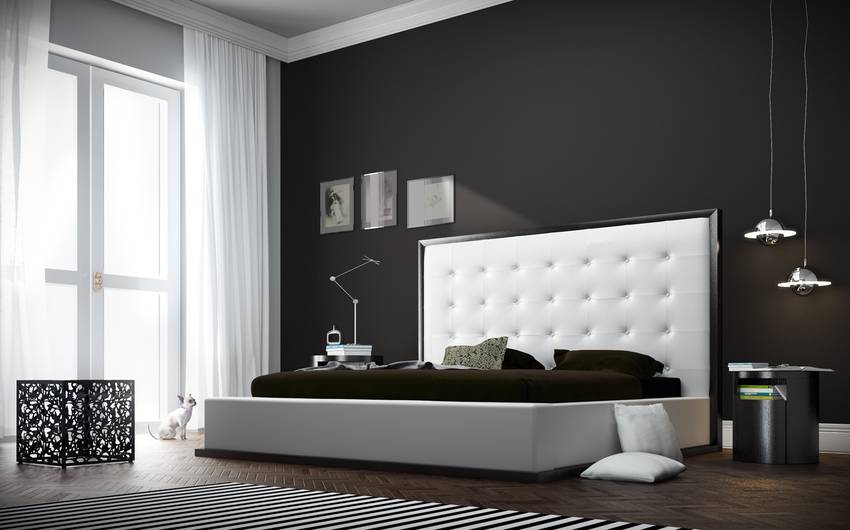 Черную спальню с белыми стенами можно оформить под стиль модерн. Удобное ложе с декоративным изголовьем играет главную роль. Направление тяготеет к природным мотивам, мягким изгибам без углов. В интерьере используют орнаменты с растительными или животными узорами. Контрастные вставки обозначают расположение функциональных зон.