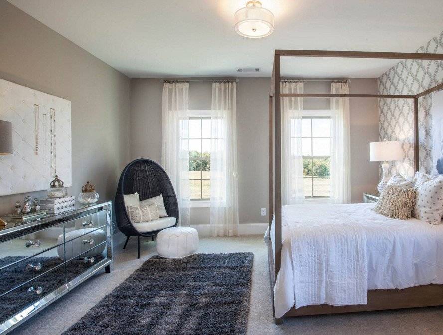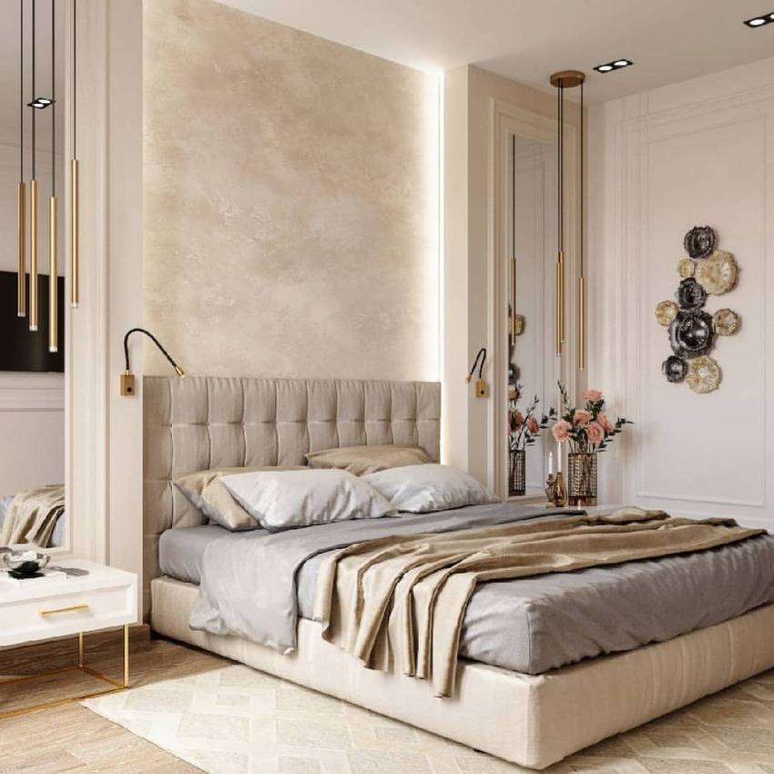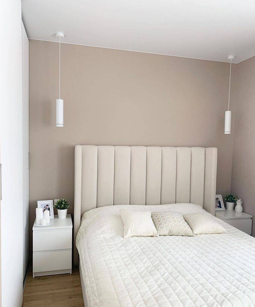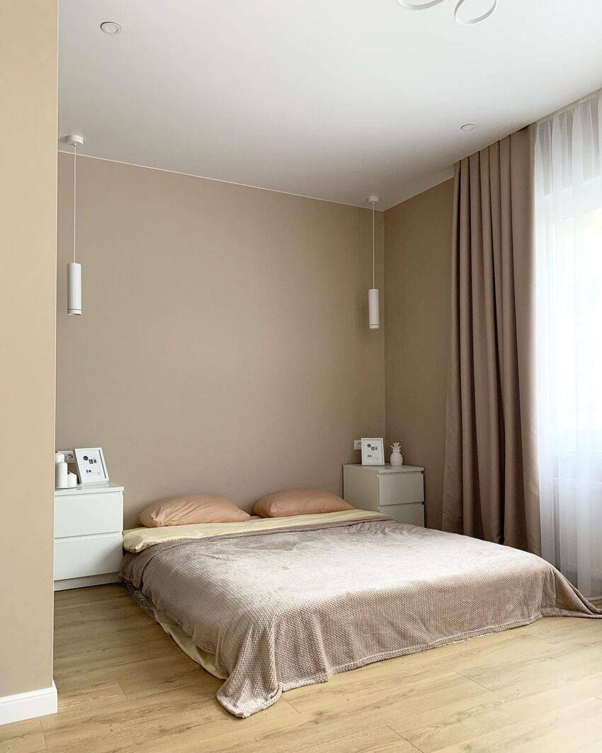 Отдавая предпочтение бледным оттенкам, необходимо грамотно подобрать мебель, акцентируя внимание на ней. Серая спальня не будет казаться скучной, если разбавить интерьер ярким текстилем и аксессуарами. Бежевая цветовая гамма отличается разнообразностью оттенков — от молочного до кофейного