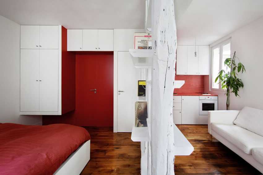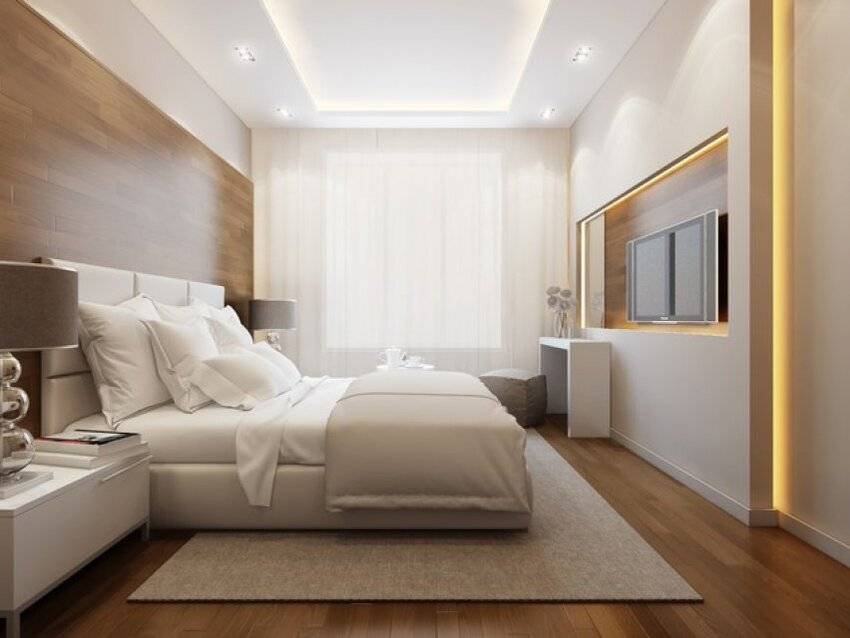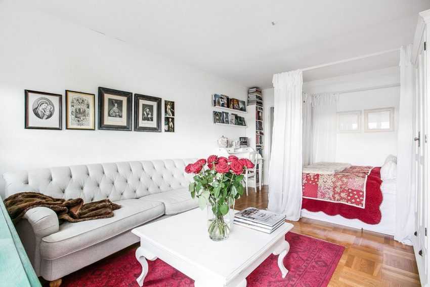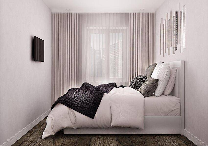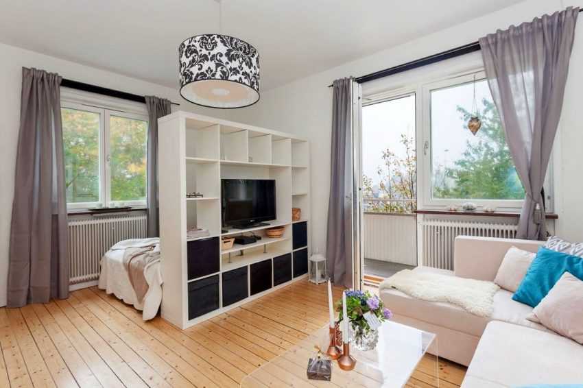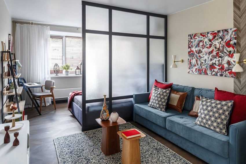 Можно ограничится визуальным зонированием — условно отделить кровать от остального пространства с помощью полок, стеллажей или просто ограничив место на полу ковриком. Если отказаться от кровати в пользу раскладного дивана и повесить на стену спальни телевизор — днем комната будет мало чем отличаться от гостиной.