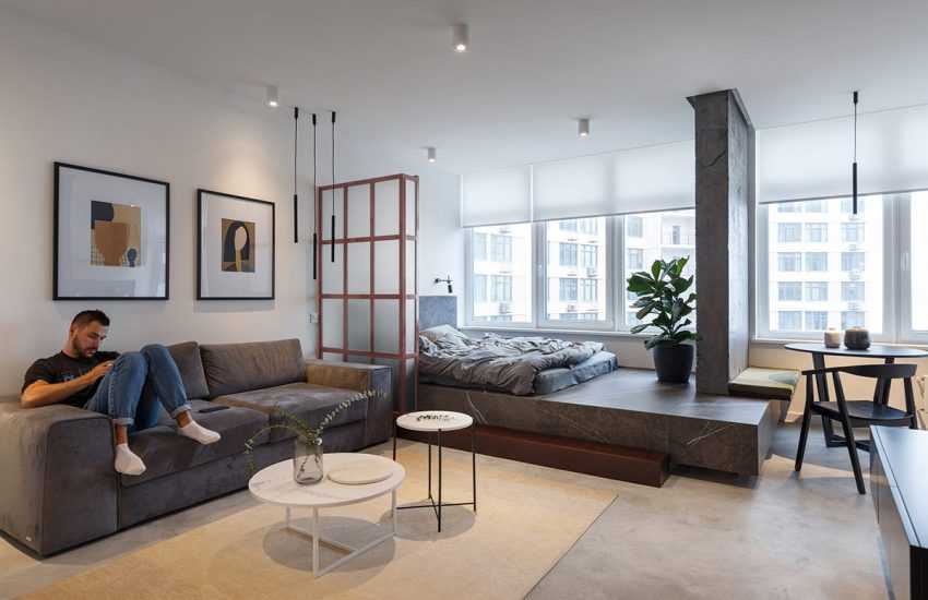 Второй вариант часто используется в «однушке», квартире-студии и дизайне большой спальни, объединенной с гостиной, как на фото-примерах.