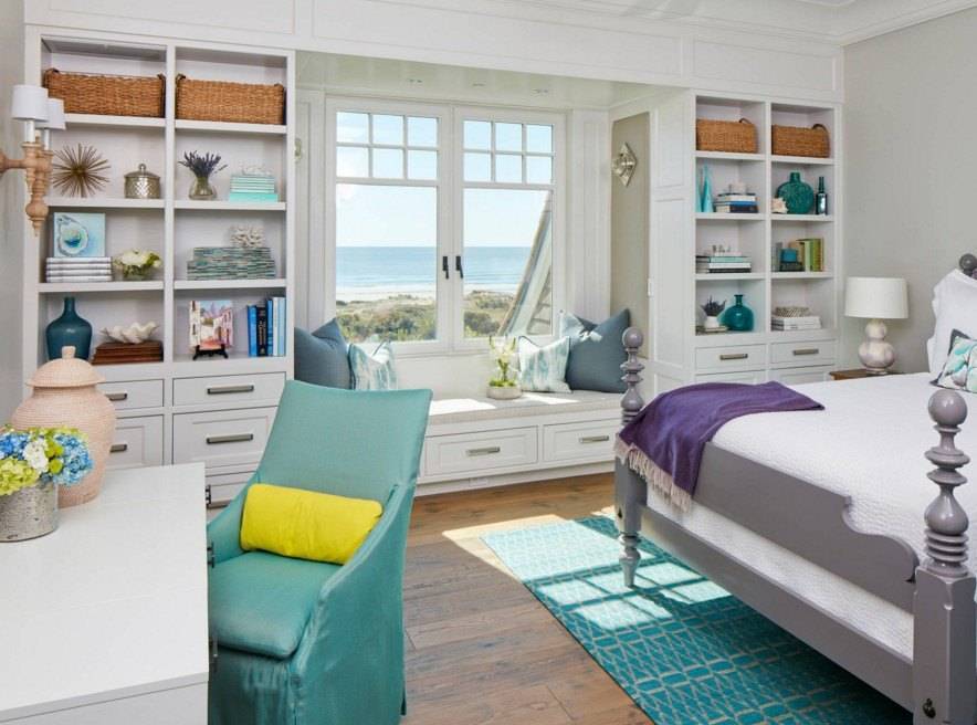 | Городской | Светлые стены дополнят бледные морские пейзажи. Изумрудная, фиалковая или голубая кровать станет визуальным центром помещения, при этом все декоративные элементы должны соответствовать этому оттенку и перекликаться с ним. |