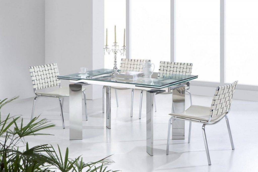 В сложенном виде он подойдет для уютных домашних вечеров с семьей, а разложенный, он вместит целую компанию друзей. Белый стол со стеклянными вставками выглядит невесомым по сравнению с деревянными и пластиковыми аналогами.