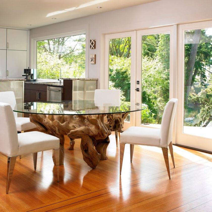 В узких столовых прямоугольный стеклянный стол аккуратно встанет к окну или к стене, не загромождая пространство, такой вариант представлен на фото слева. На фото справа – интерьер в стиле фьюжн, отрезок стекла используют как защитную крышку над резной деревянной поверхностью.