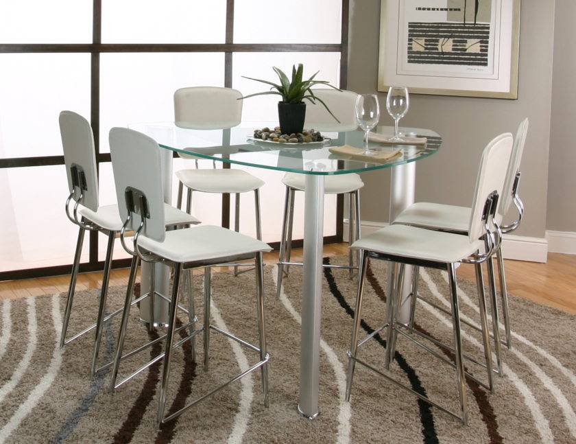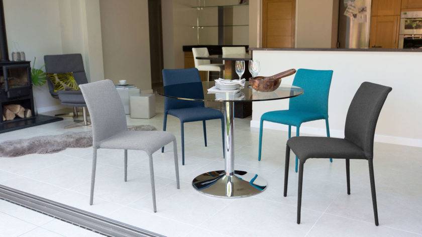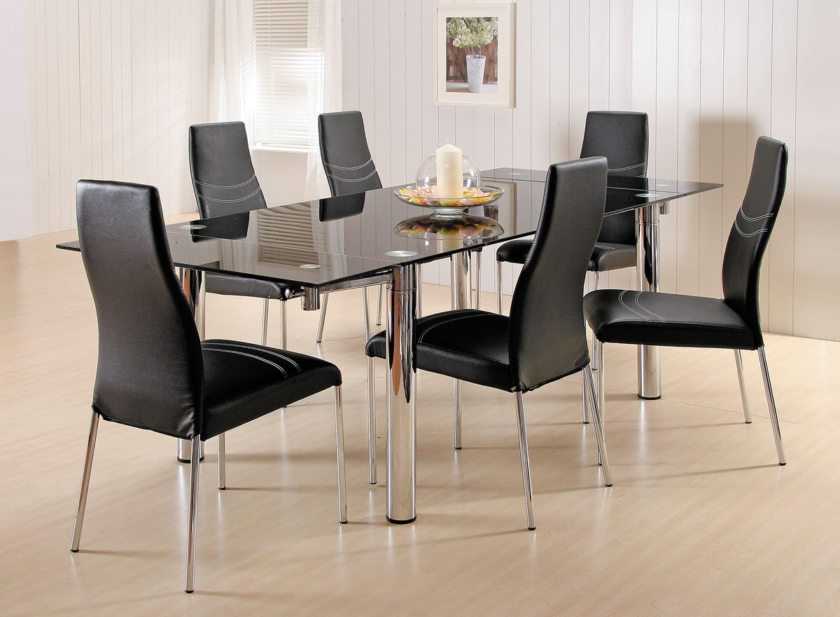 Стекло может сочетаться почти со всеми материалами. Но у стеклянного стола есть подстолье – его цвет и фактуру надо учитывать при выборе стульев. Например, если ножки стола и подстолье хромированные, то стулья предпочтительнее приобрести на каркасе с отделкой из хрома. Обивка может быть любой – это относится к цвету и материалу.