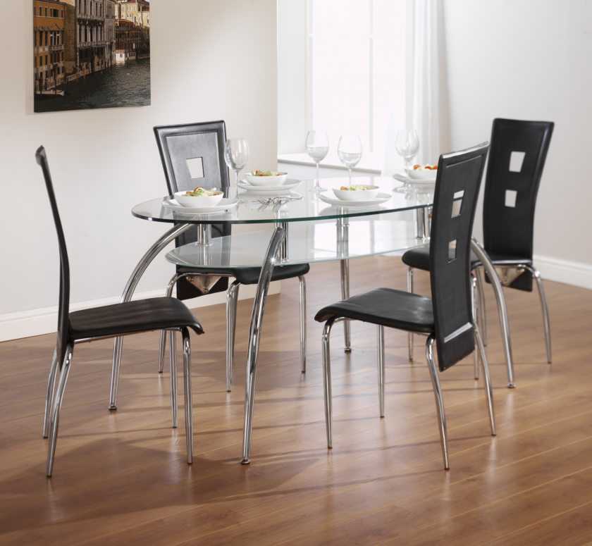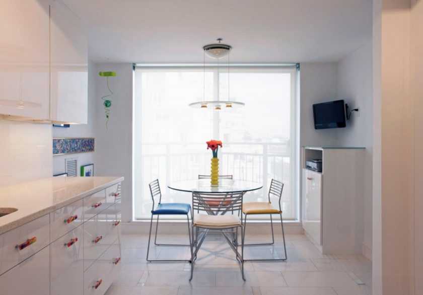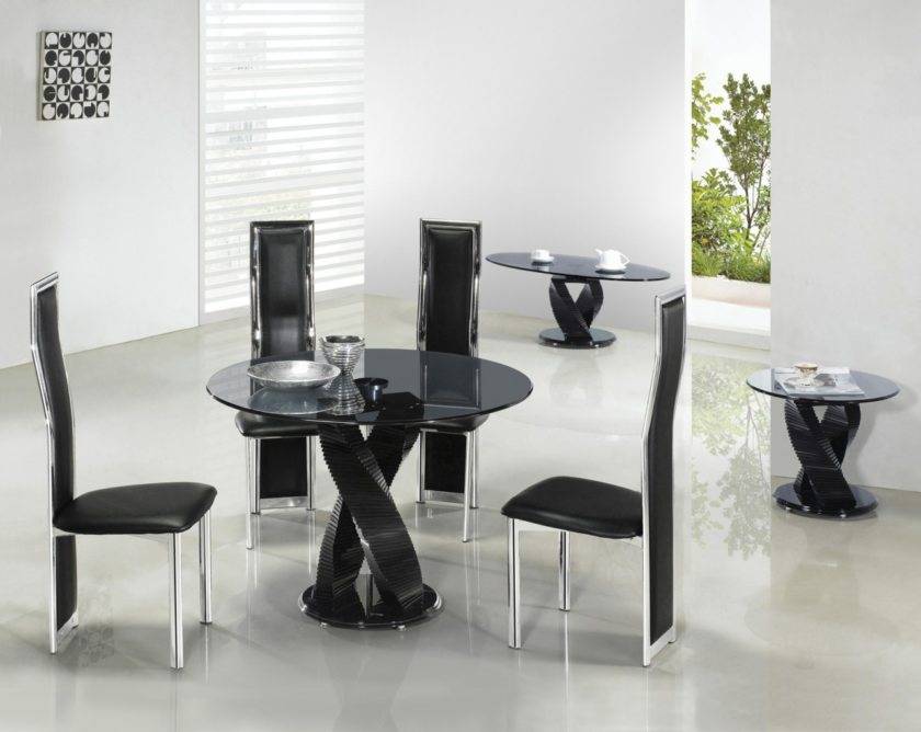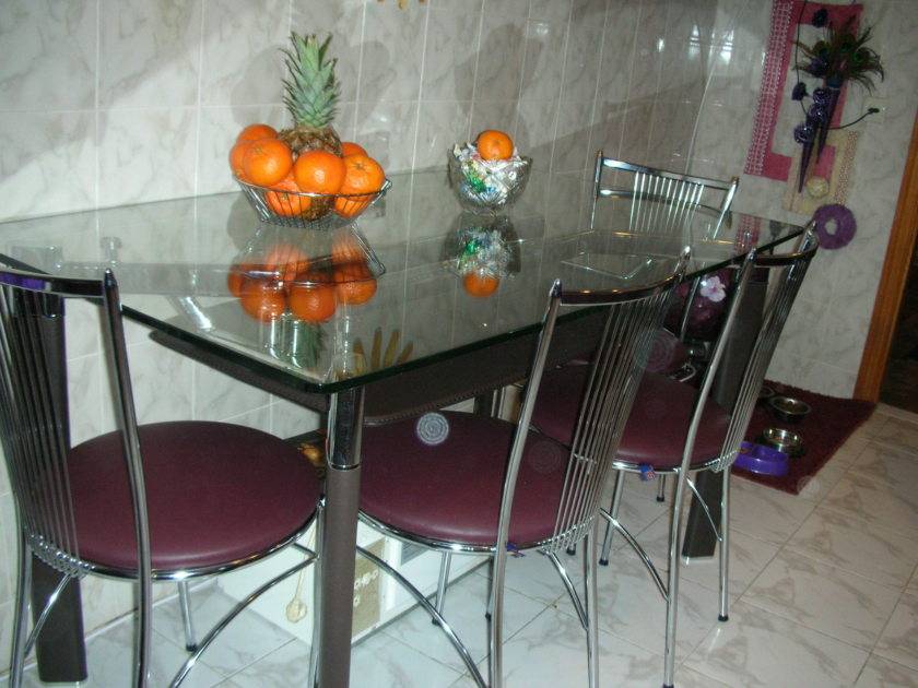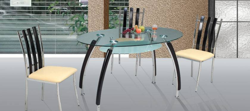 Для широкой – стол стеклянный круглый или овальный. В маленькую кухню также может вместиться стеклянный стол небольшого диаметра.