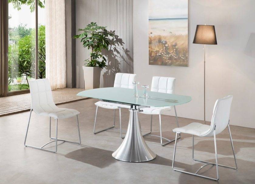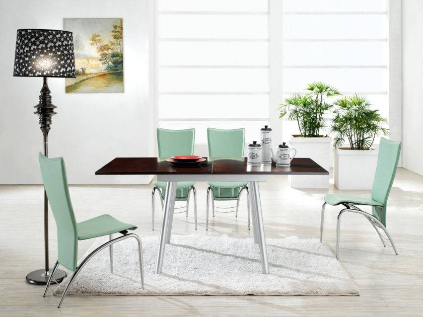 Кроме прямоугольного, можно использовать стол стеклянный раздвижной или стол-трансформер со стеклянной столешницей. В сложенном виде они занимают скромную площадь, а в случае необходимости могут увеличиться в высоту.