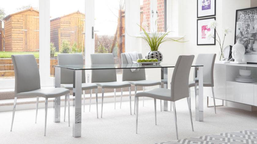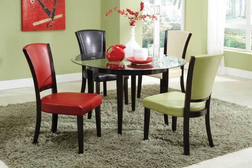 К стеклянным столам подходят стулья любых оттенков. Диапазон начинается от светлых и кончается яркими. Стол будет нейтральной вещью в интерьере, а стулья станут ярким акцентом. Невесомый стеклянный стол современного стиля будет хорошо сочетаться с прозрачными и полупрозрачными пластиковыми стульями. Такой вариант подойдет для помещений любой площади.
