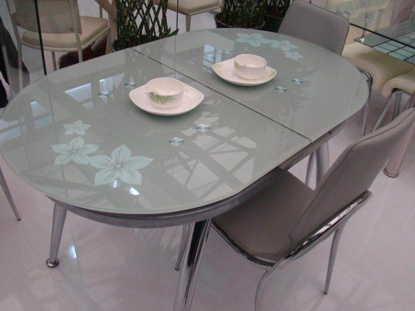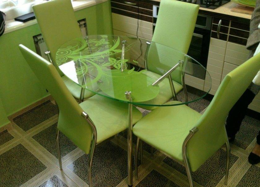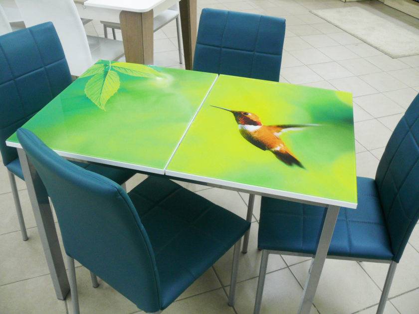 Столы с разнообразными принтами замечательно впишутся как в классический, так и в авангардный интерьер. Цветочные мотивы украсят светлую кухню в стиле прованс, добавят колорита в винтажный интерьер. Стеклянный стол может быть и раскладным. Этот предмет мебели подойдет не только для маленькой кухни.