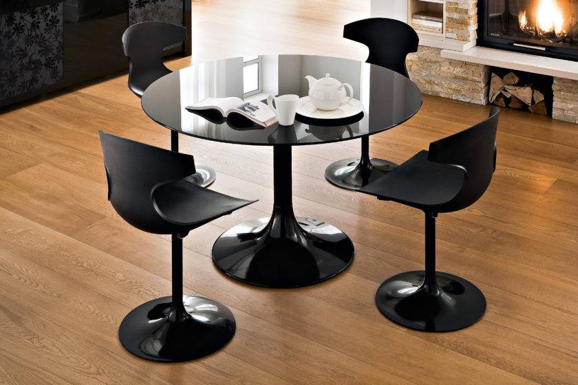 - Матовое. Такой вид материала для столешницы несет чисто эстетическую функцию. Круглые матовые столы светлых или тёмных оттенков смотрятся невероятно стильно.